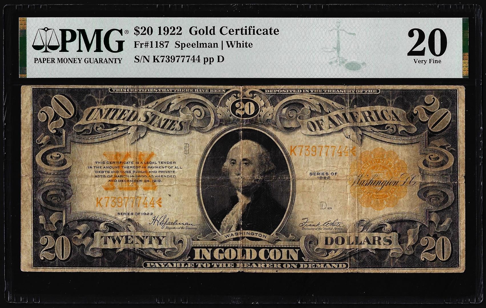 1922 $20 Gold Certificate Note Fr.1187 PMG Very Fine 20