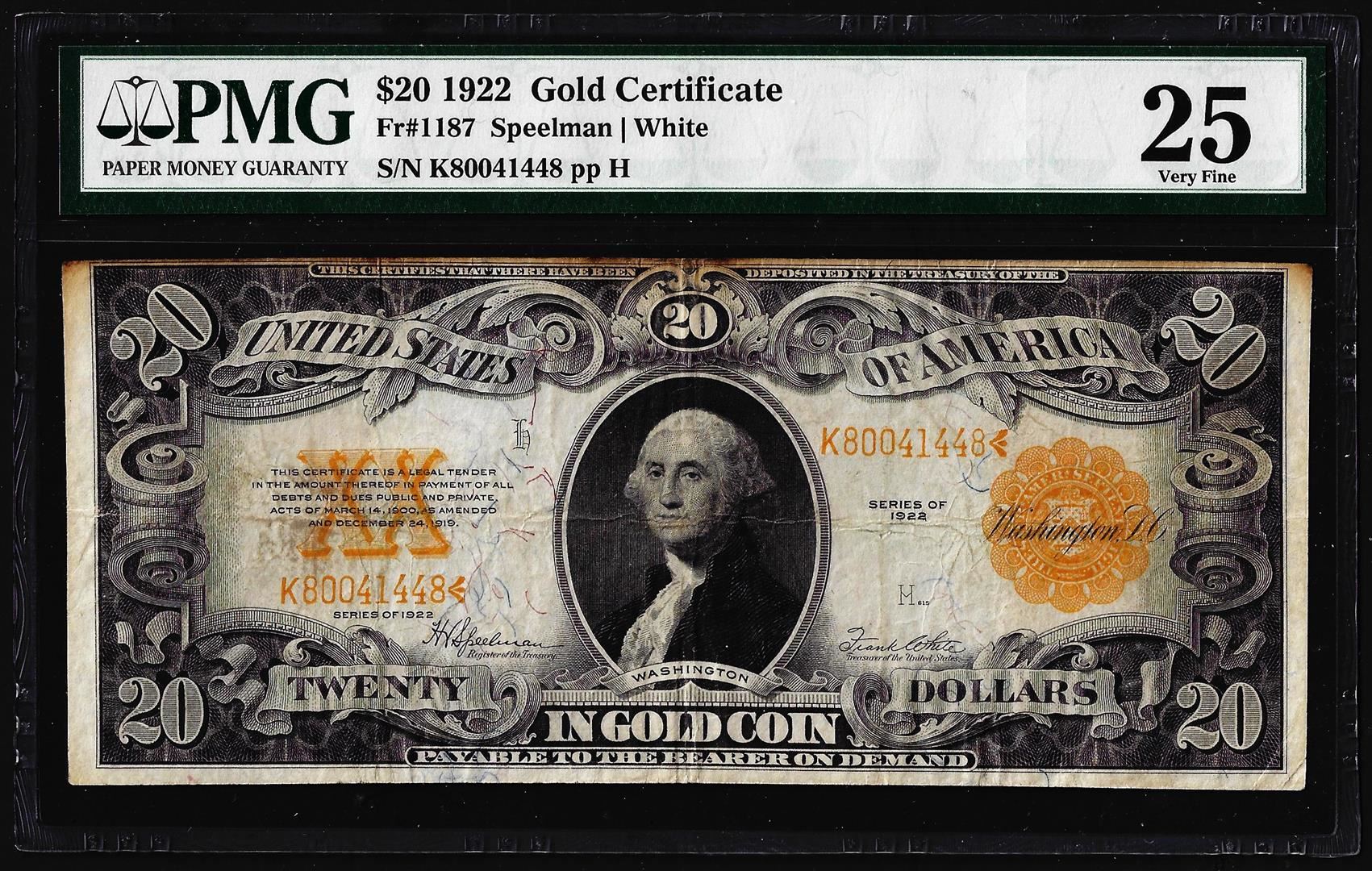 1922 $20 Gold Certificate Note Fr.1187 PMG Very Fine 25
