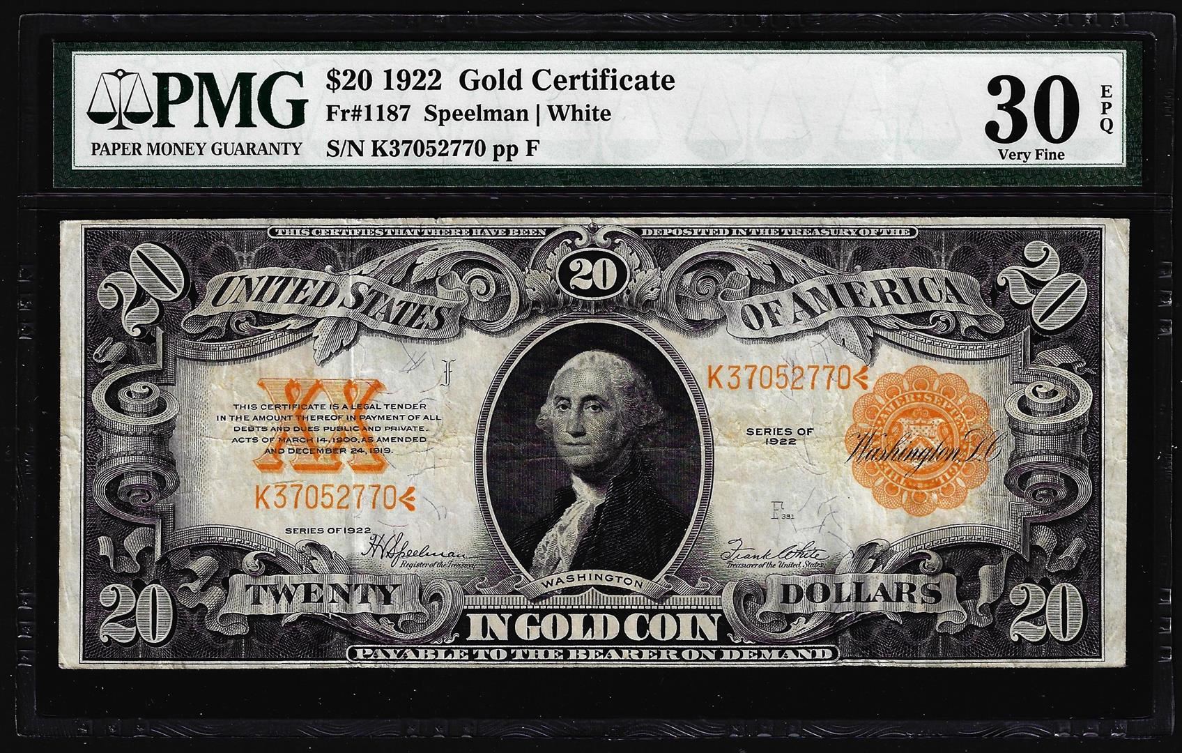 One 1922 $20 Gold Certificate Note Fr.1187 PMG Very Fine 30EPQ. PMG Certified.