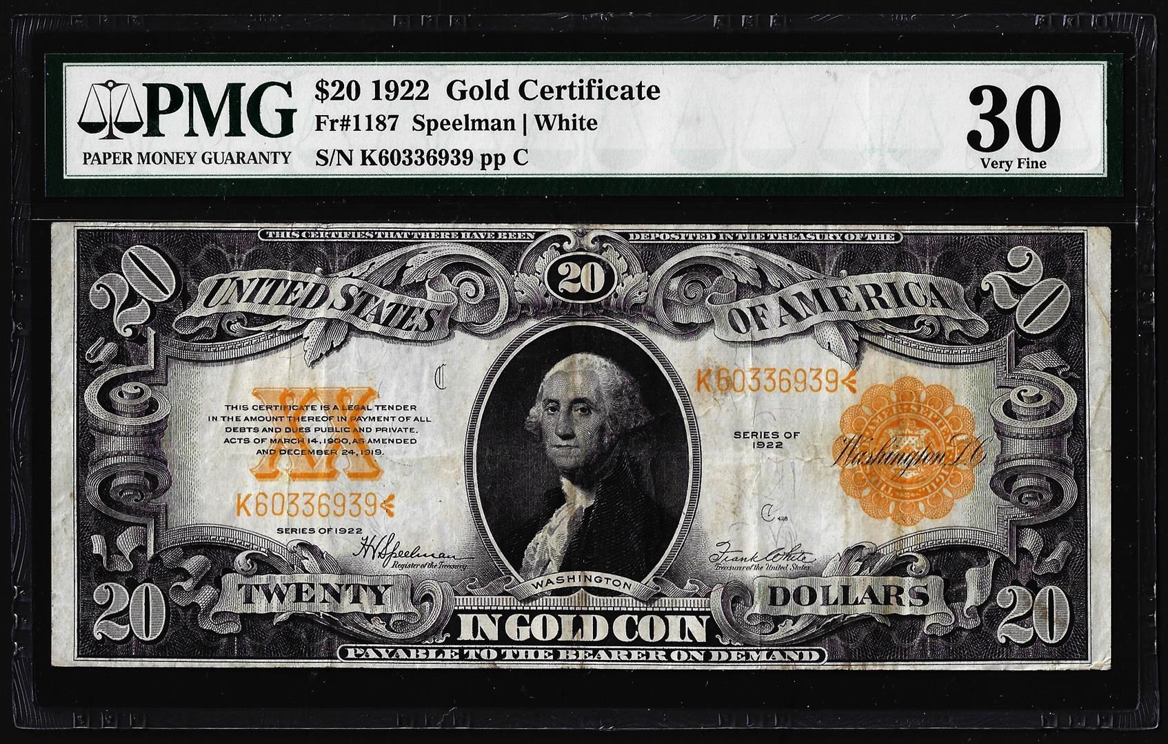 1922 $20 Gold Certificate Note Fr.1187 PMG Very Fine 30