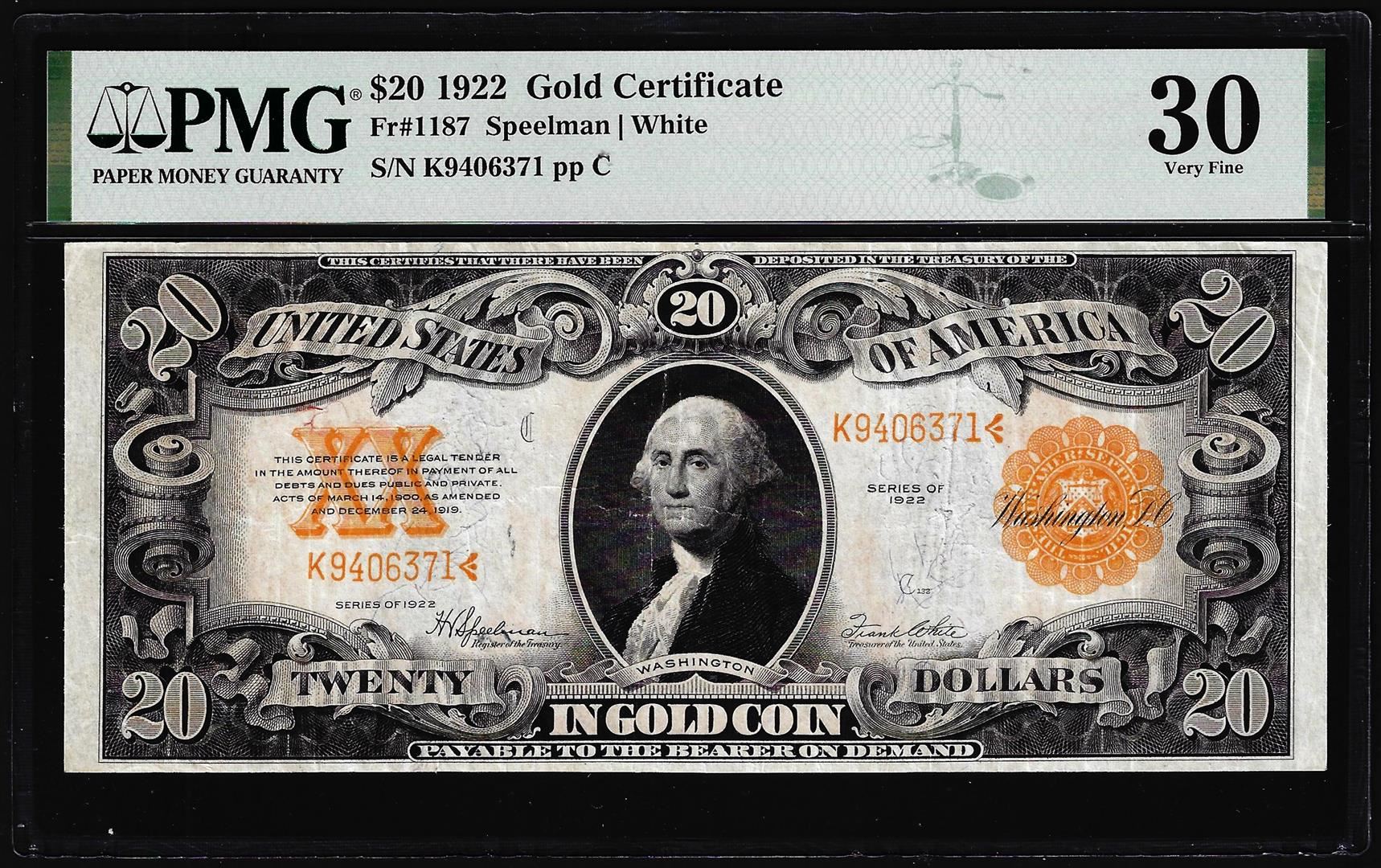 One 1922 $20 Gold Certificate Note Fr.1187 PMG Very Fine 30. PMG Certified.