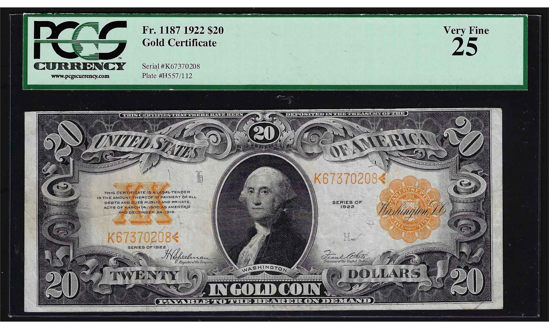 One 1922 $20 Gold Certificate Note PCGS VF25. PCGS Graded.