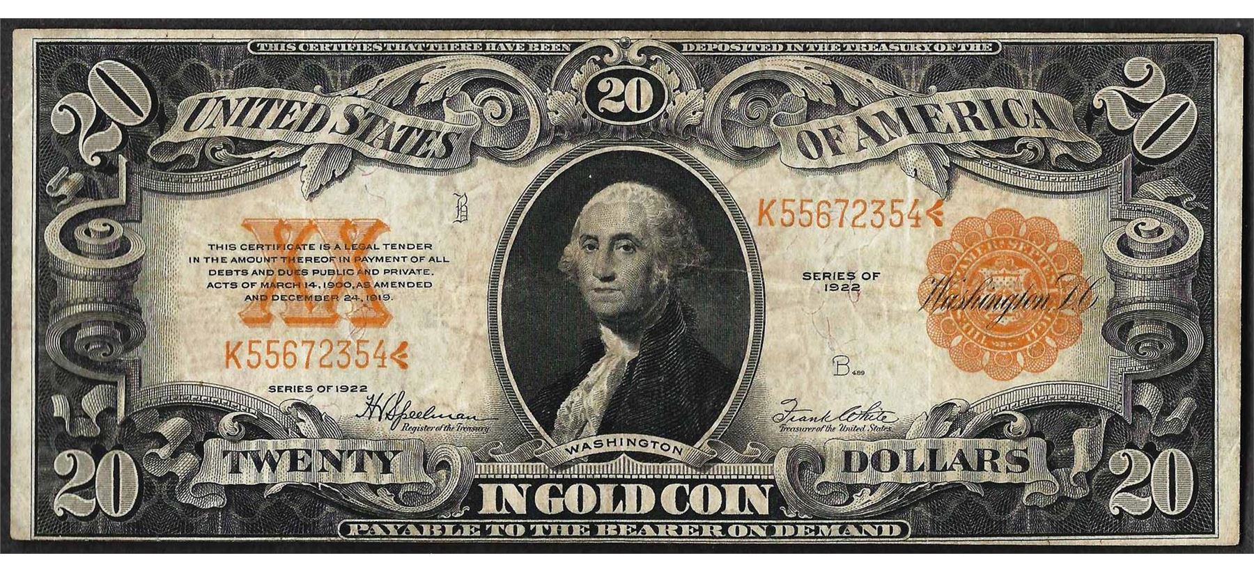 One 1922 $20 Gold Certificate Note.