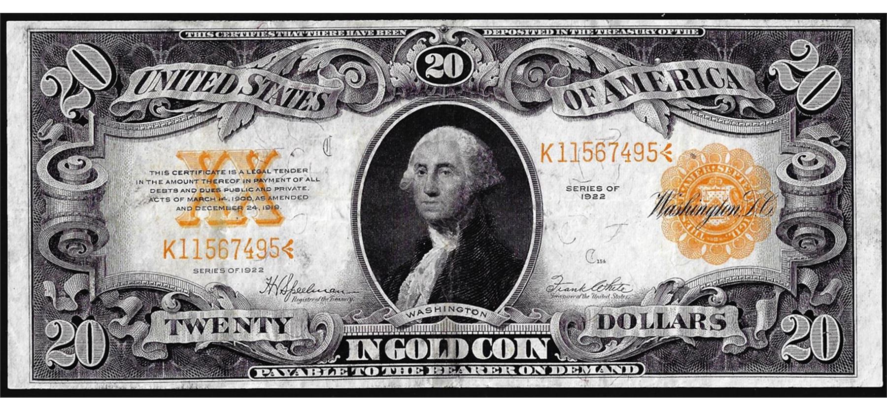 One 1922 $20 Gold Certificate Note.