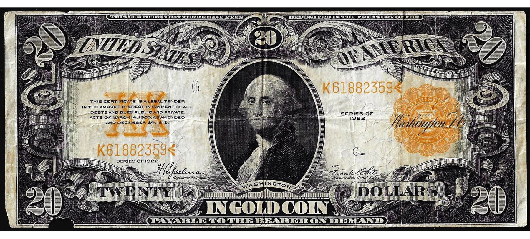 One 1922 $20 Gold Certificate Note.