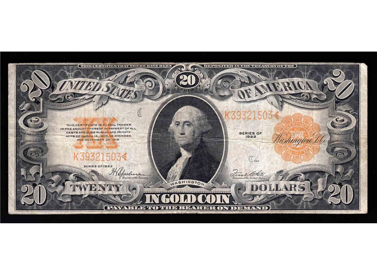 One 1922 $20 Large Size Gold Certificate Note- Pinhole.