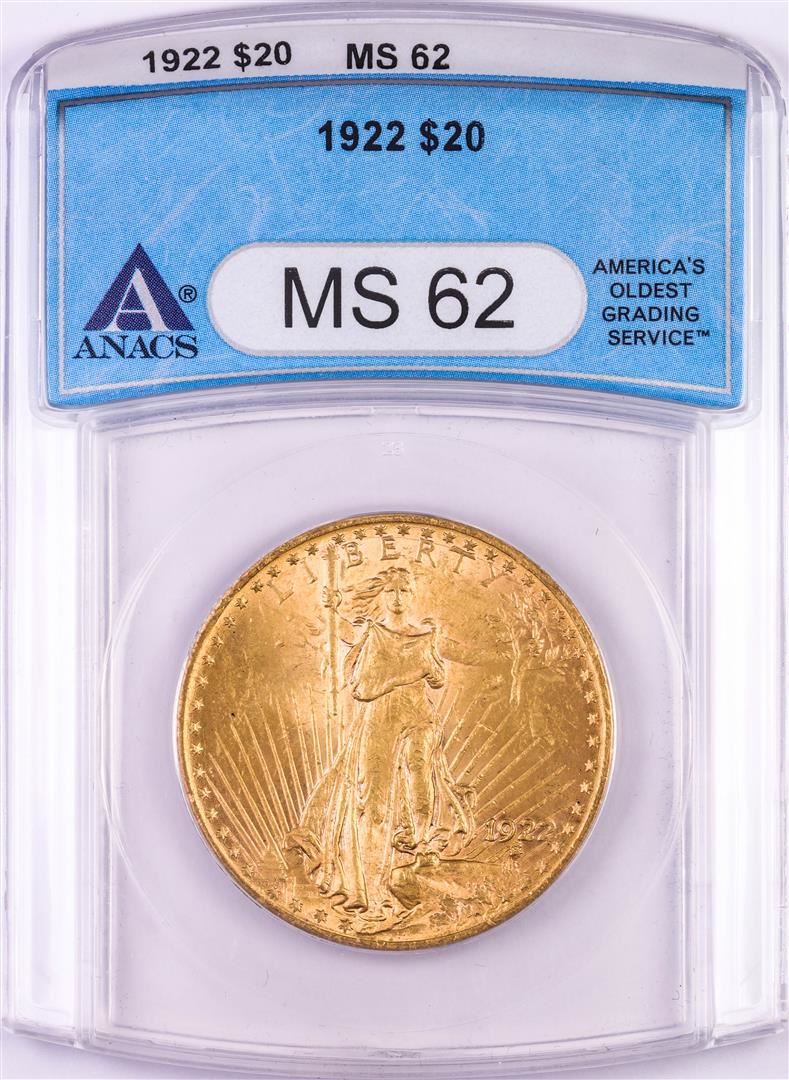 One 1922 $20 St. Gaudens Double Eagle Gold Coin ANACS MS62. ANACS Certified.