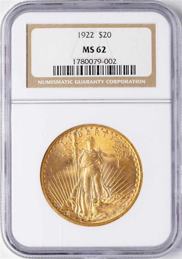 One 1922 $20 St. Gaudens Double Eagle Gold Coin NGC MS62. NGC Certified.