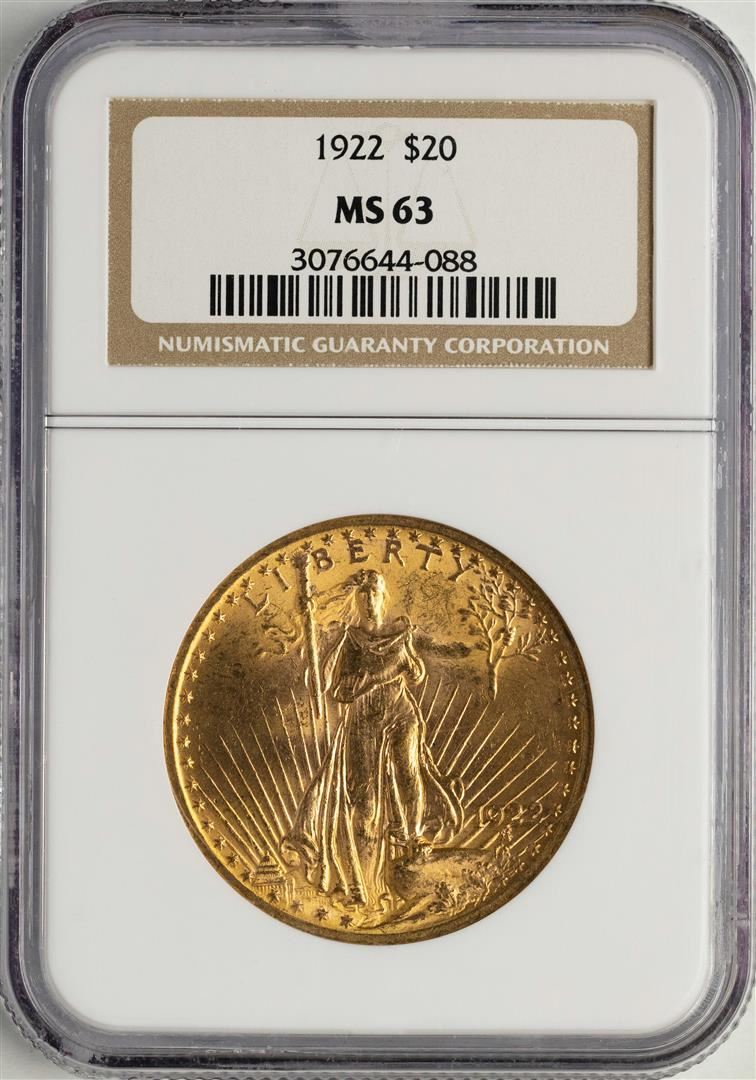 One 1922 $20 St. Gaudens Double Eagle Gold Coin NGC MS63. NGC Certified.
