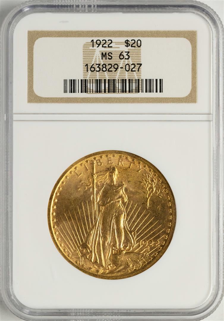 One 1922 $20 St. Gaudens Double Eagle Gold Coin NGC MS63. NGC Certified.