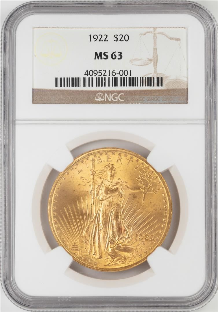 One 1922 $20 St. Gaudens Double Eagle Gold Coin NGC MS63. NGC Certified.