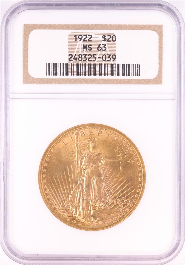 One 1922 $20 St. Gaudens Double Eagle Gold Coin NGC MS63. NGC Certified.