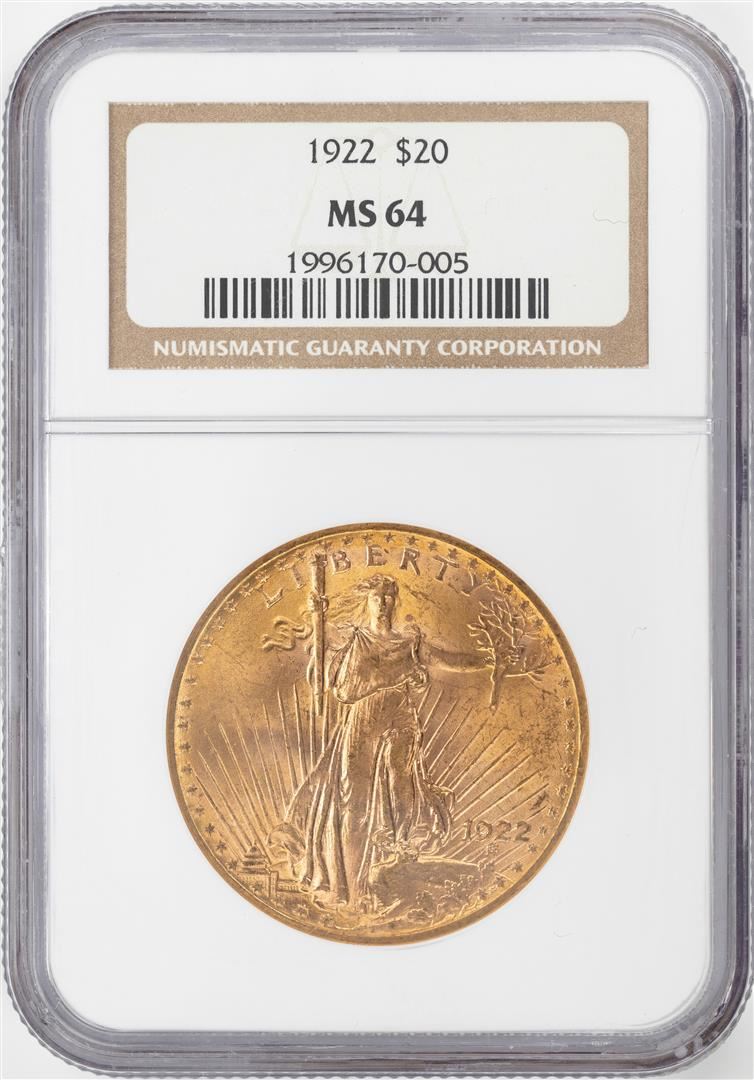 One 1922 $20 St. Gaudens Double Eagle Gold Coin NGC MS64. NGC Certified.