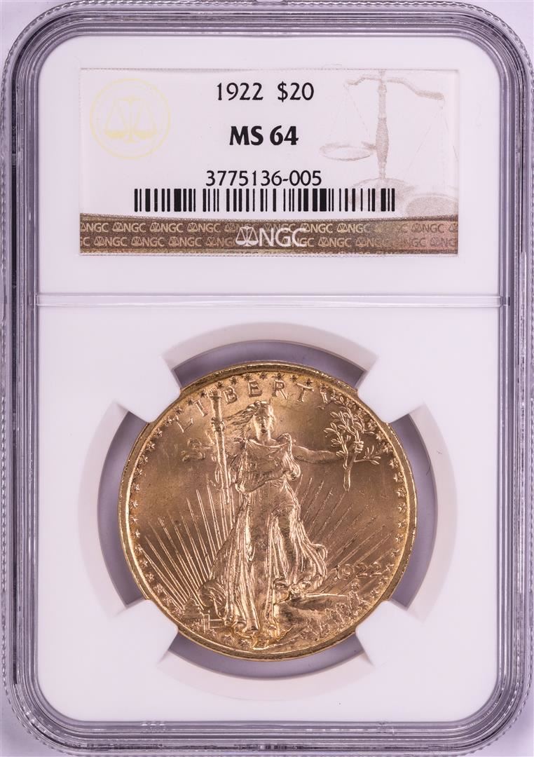1922 $20 St. Gaudens Double Eagle Gold Coin NGC MS64