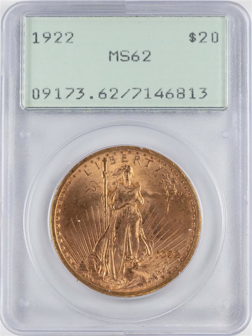 One 1922 $20 St. Gaudens Double Eagle Gold Coin PCGS MS62 Green Rattler Holder. PCGS Graded.