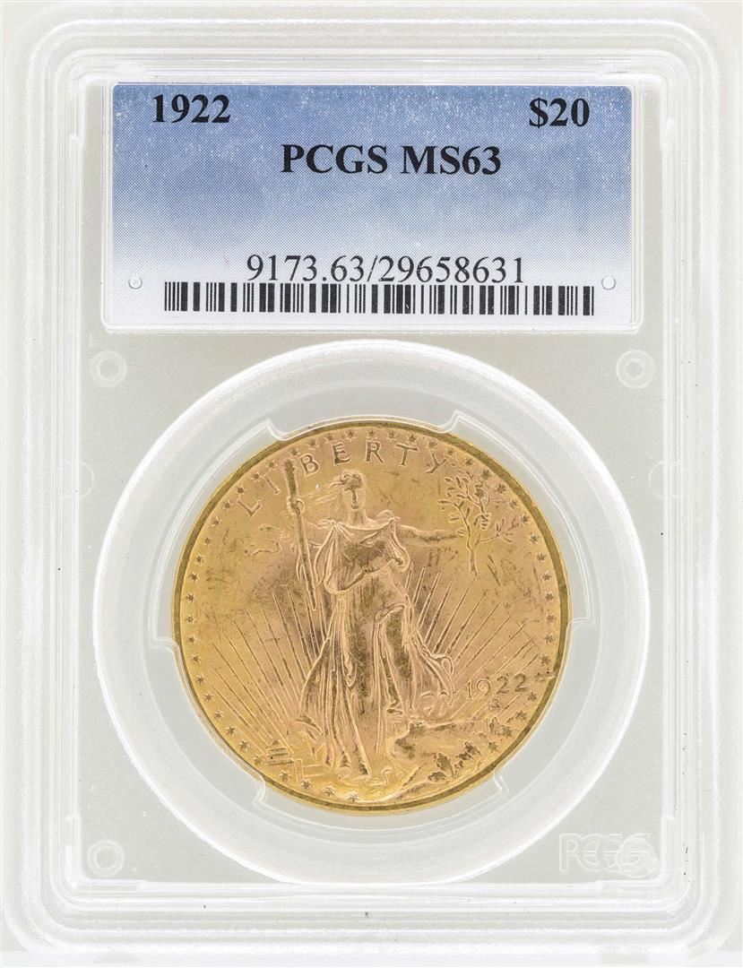 One 1922 $20 St. Gaudens Double Eagle Gold Coin PCGS MS63. PCGS Graded.