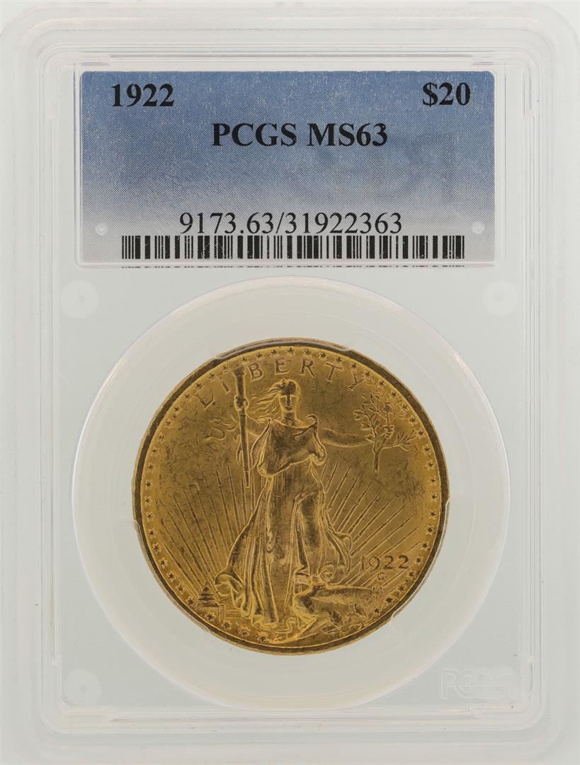 One 1922 $20 St. Gaudens Double Eagle Gold Coin PCGS MS63. PCGS Graded.