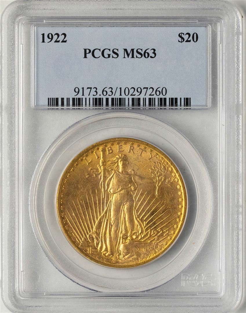One 1922 $20 St. Gaudens Double Eagle Gold Coin PCGS MS63. PCGS Graded.