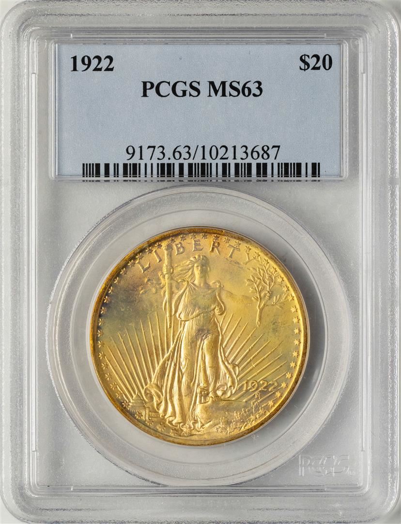 One 1922 $20 St. Gaudens Double Eagle Gold Coin PCGS MS63. PCGS Graded.