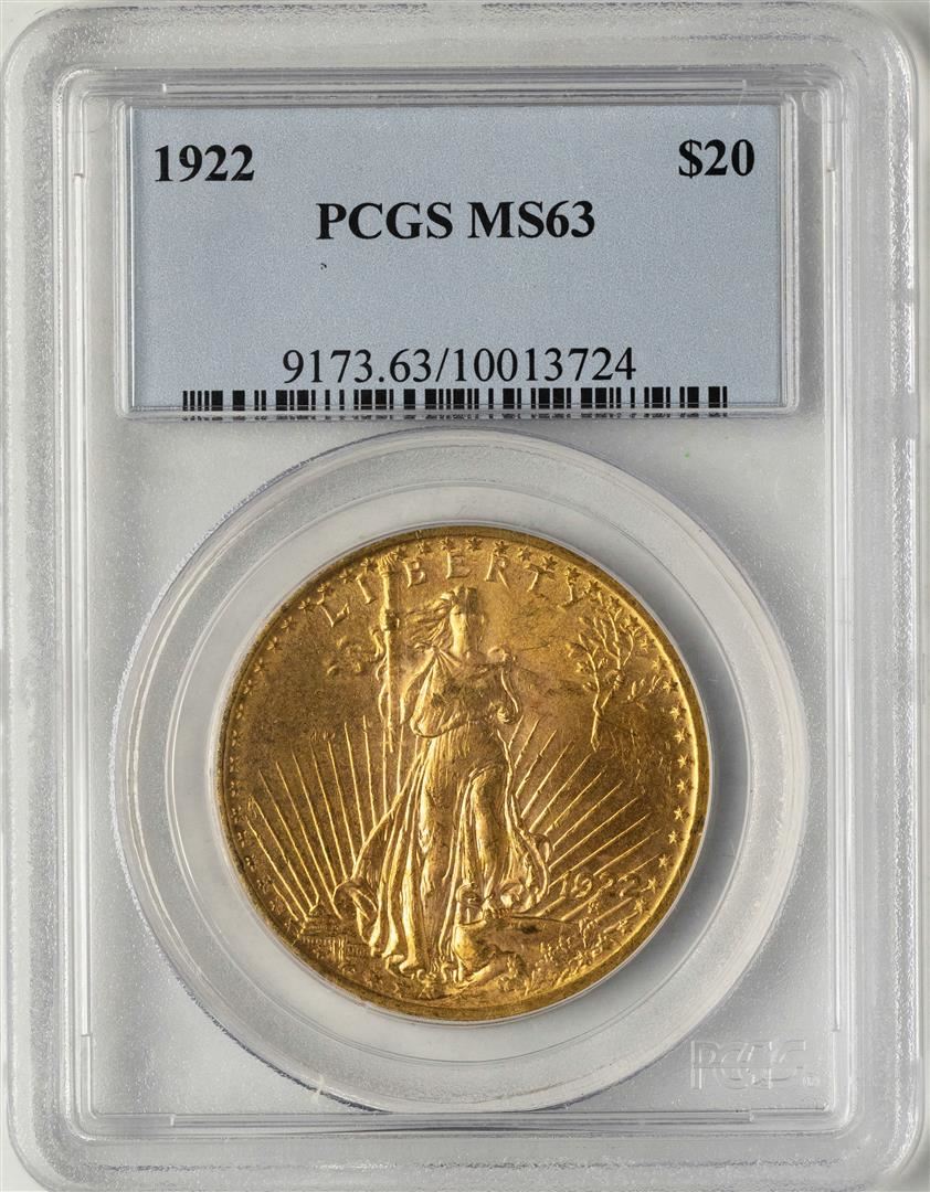 One 1922 $20 St. Gaudens Double Eagle Gold Coin PCGS MS63. PCGS Graded.
