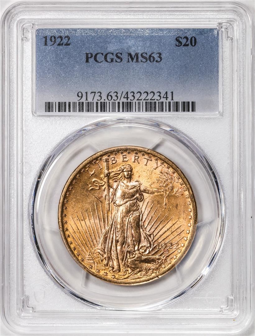 One 1922 $20 St. Gaudens Double Eagle Gold Coin PCGS MS63. PCGS Graded.