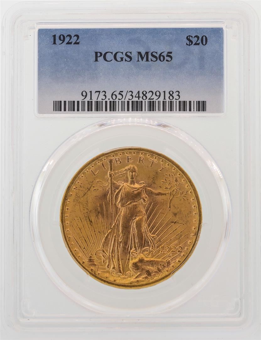 One 1922 $20 St. Gaudens Double Eagle Gold Coin PCGS MS65. PCGS Graded.