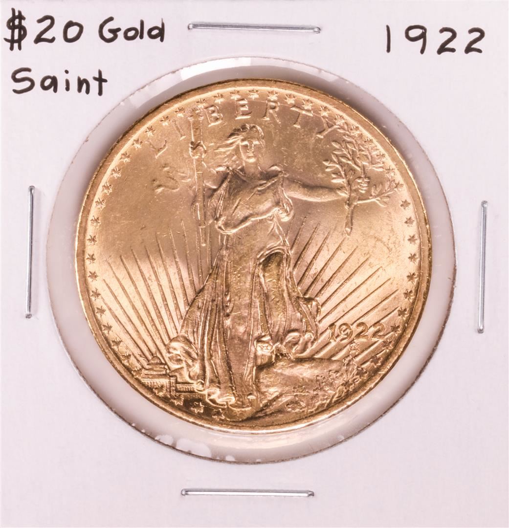 One 1922 $20 St. Gaudens Double Eagle Gold Coin.