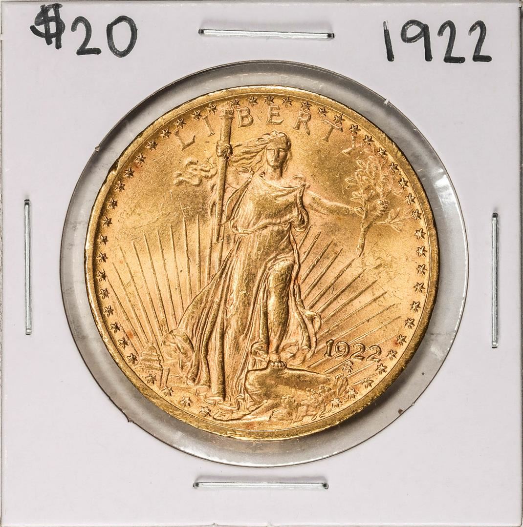 One 1922 $20 St. Gaudens Double Eagle Gold Coin.
