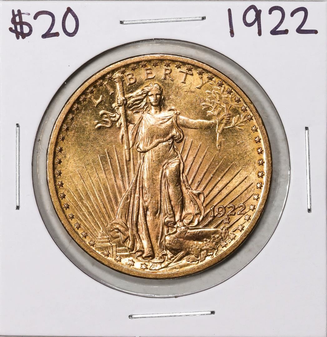 One 1922 $20 St. Gaudens Double Eagle Gold Coin.