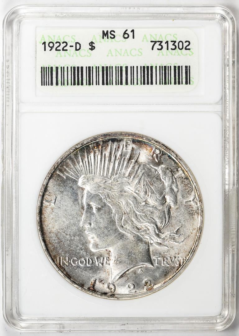 One 1922-D $1 Peace Silver Dollar Coin ANACS MS61 Old Soap Box. ANACS Certified.