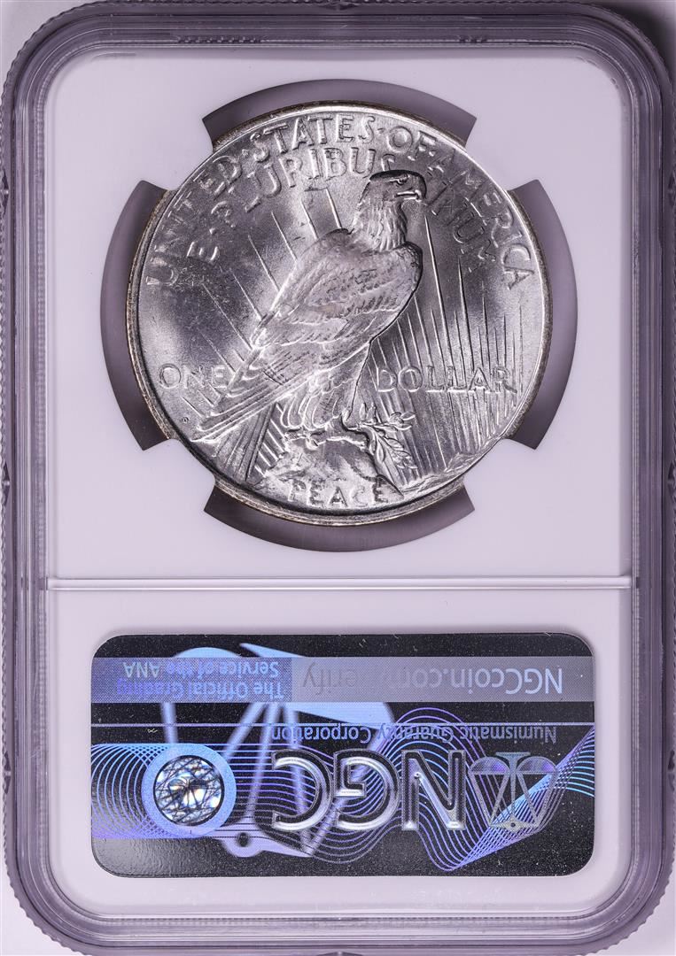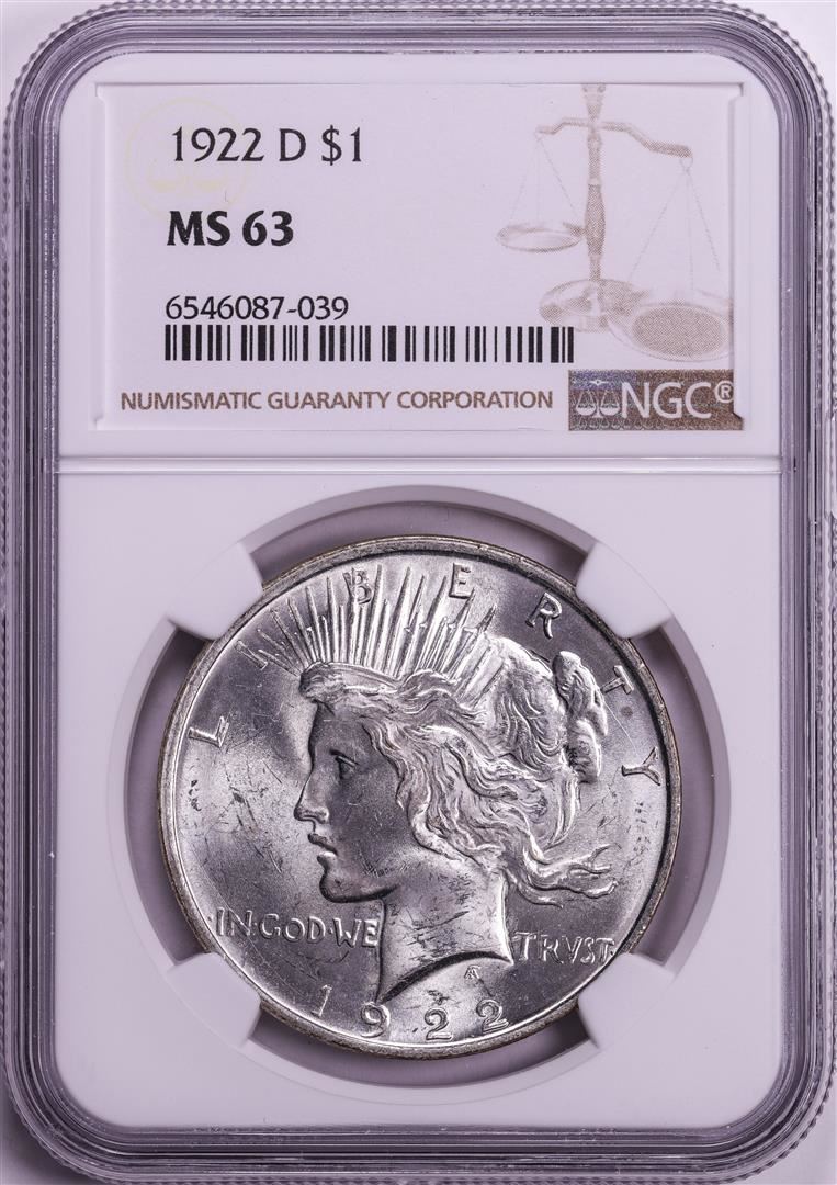 One 1922-D $1 Peace Silver Dollar Coin NGC MS63. NGC Certified.