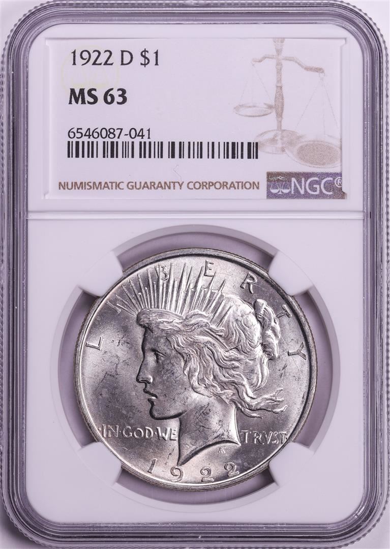 One 1922-D $1 Peace Silver Dollar Coin NGC MS63. NGC Certified.