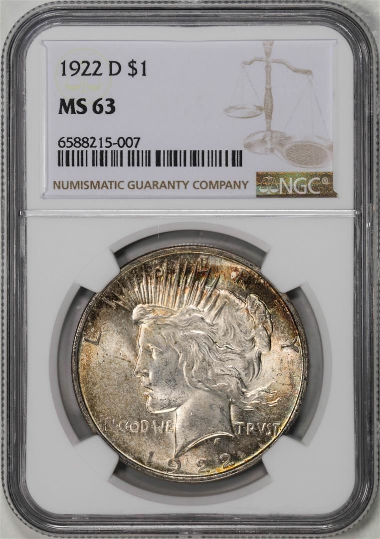 One 1922-D $1 Peace Silver Dollar Coin NGC MS63. NGC Certified.