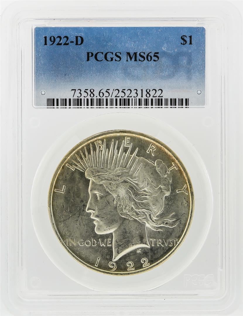 One 1922-D $1 Peace Silver Dollar Coin PCGS Graded MS65. PCGS Graded.