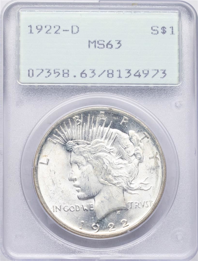 One 1922-D $1 Peace Silver Dollar Coin PCGS MS63. PCGS Graded.