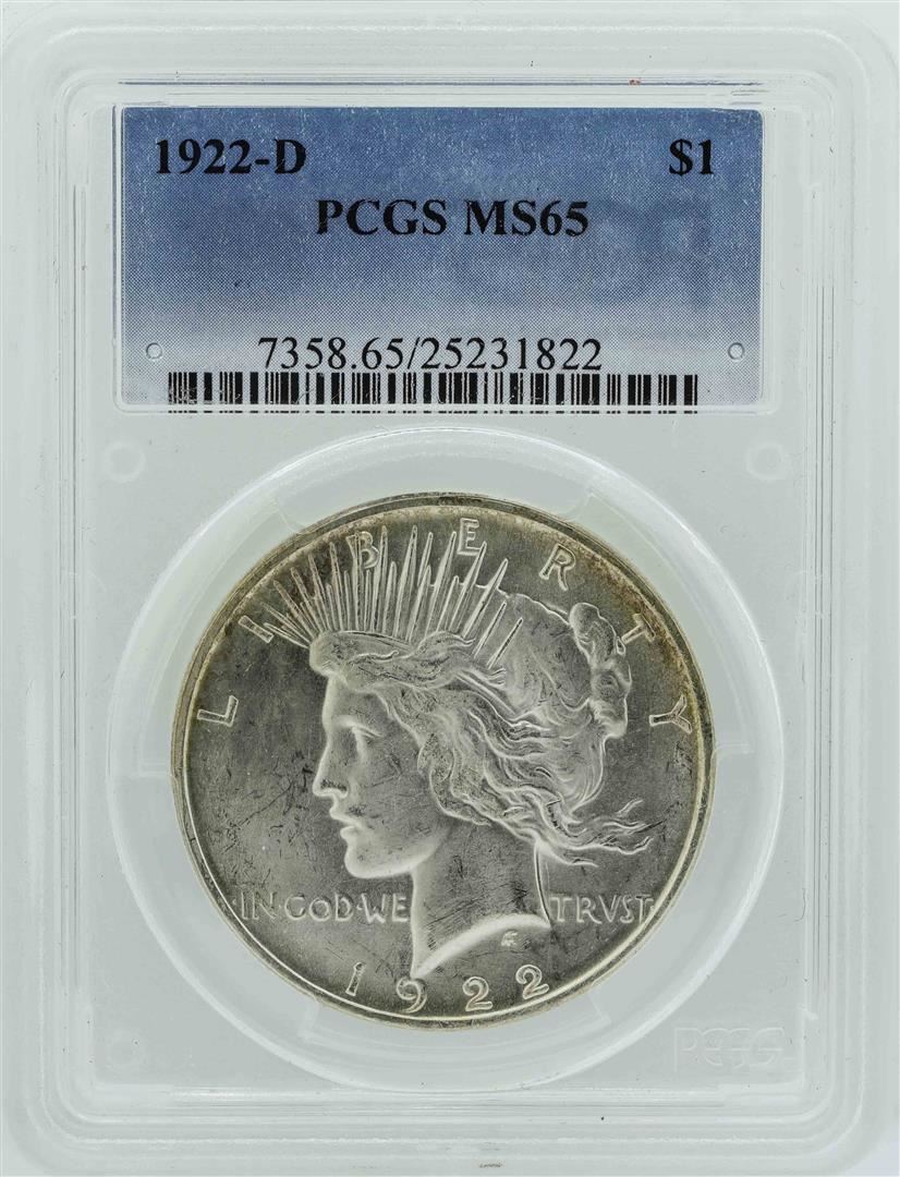 One 1922-D $1 Peace Silver Dollar Coin PCGS MS65. PCGS Graded.