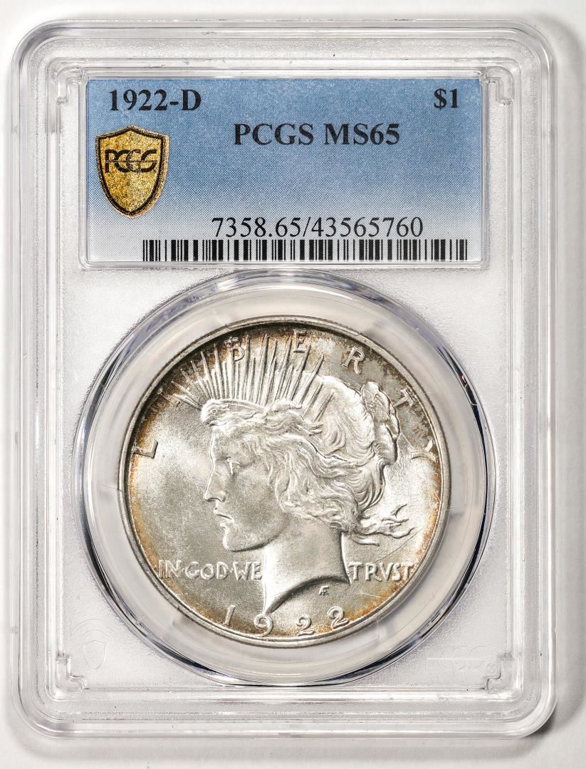 One 1922-D $1 Peace Silver Dollar Coin PCGS MS65. PCGS Graded.