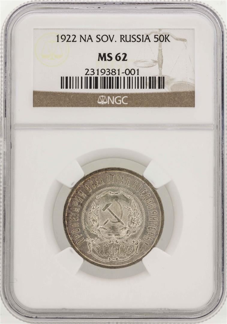 One 1922 NA Soviet Russia 50 Kopeks Silver Coin NGC MS62. NGC Certified.