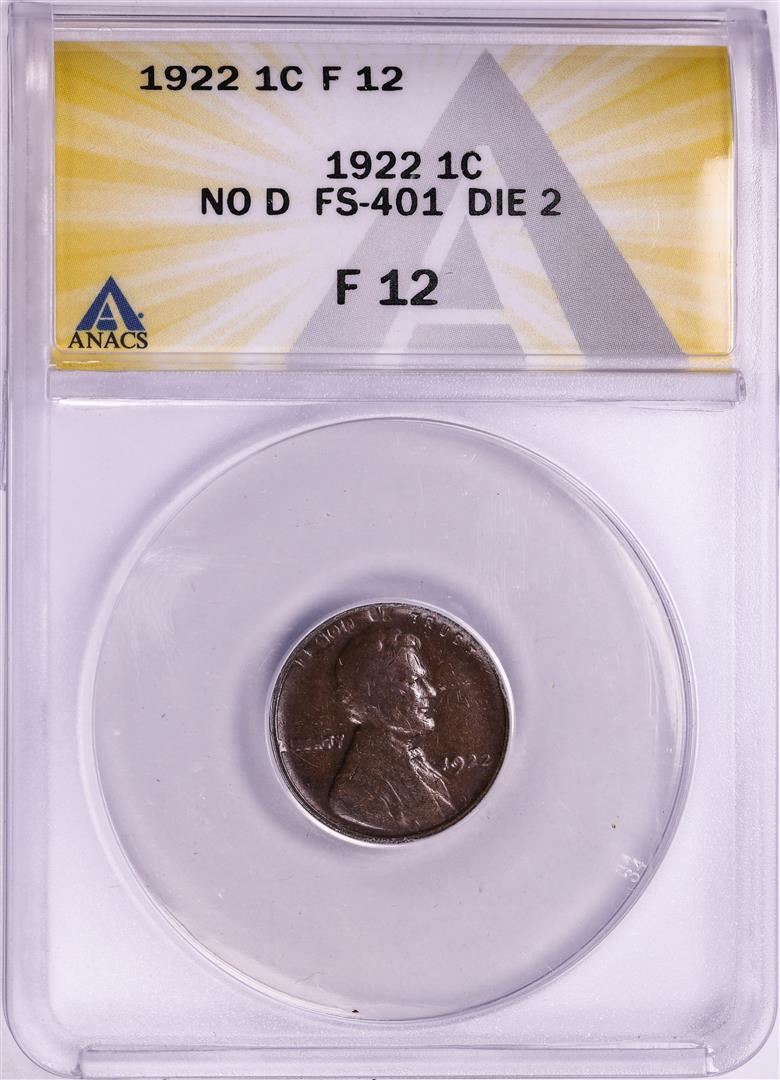 One 1922 No D FS-401 Die 2 Lincoln Wheat Cent Coin ANACS F12. ANACS Certified.