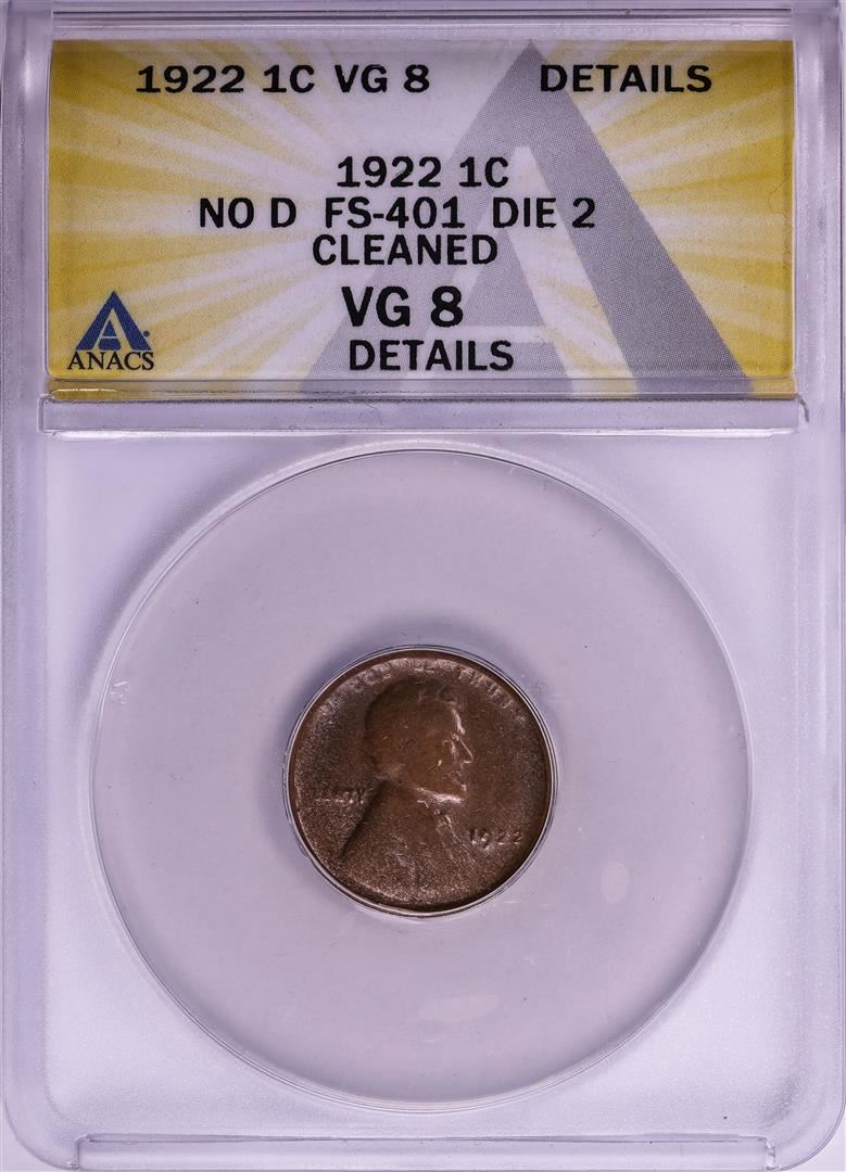One 1922 No D FS-401 Die 2 Lincoln Wheat Cent Coin ANACS VG8 Cleaned. ANACS Certified.