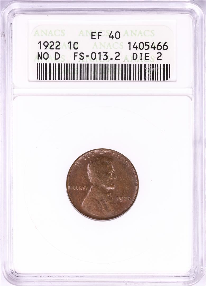 One 1922 No D Lincoln Wheat Cent Coin ANACS EF40 FS-013.2 Die 2. ANACS Certified.