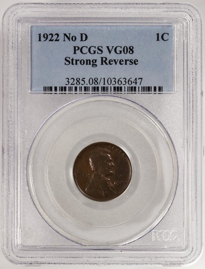 One 1922 No D Strong Reverse Lincoln Wheat Cent Coin PCGS VG08. PCGS Graded.