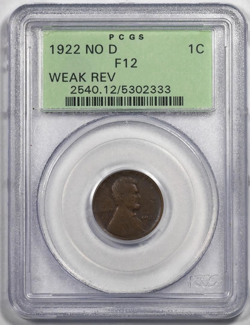 1922 No D Weak Reverse Lincoln Wheat Cent Coin PCGS F12BN Old Green Holder
