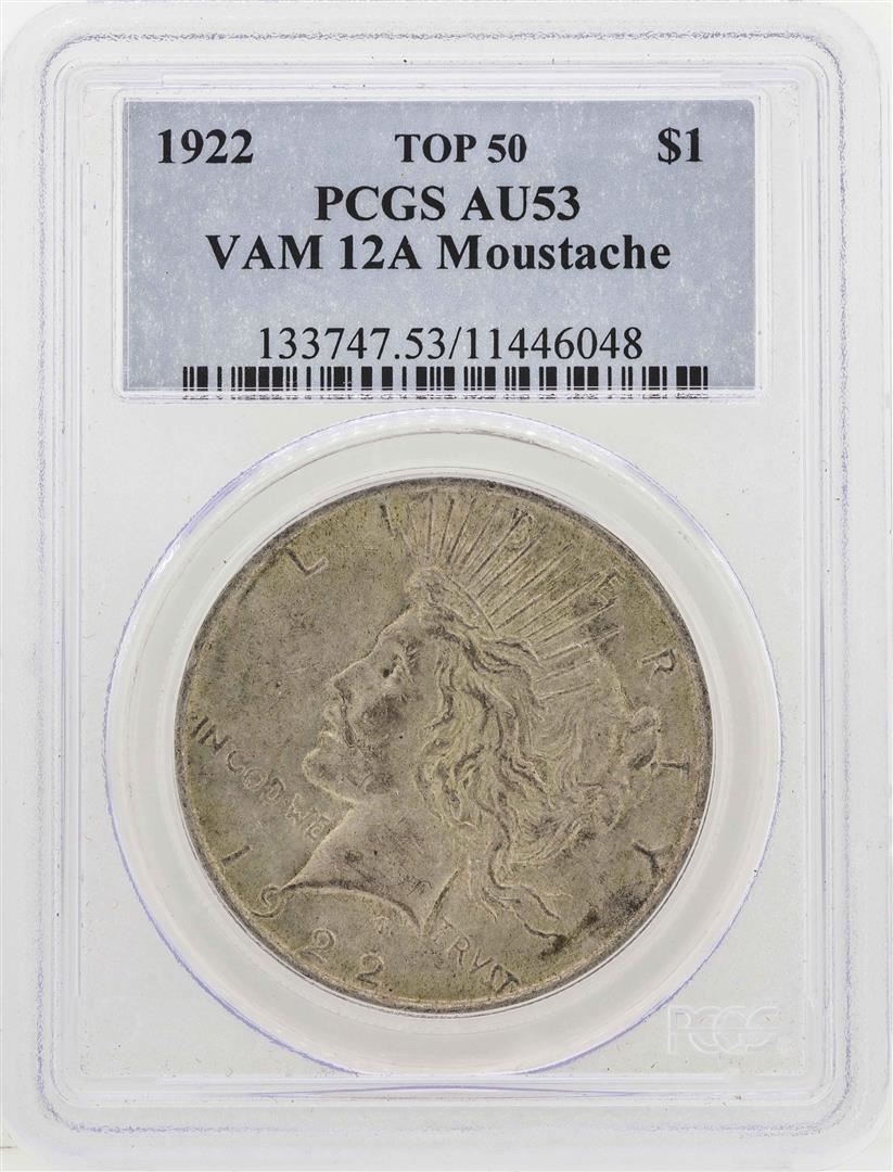 One 1922 Peace Silver Dollar PCGS AU53 VAM 12A Moustache. PCGS Graded.