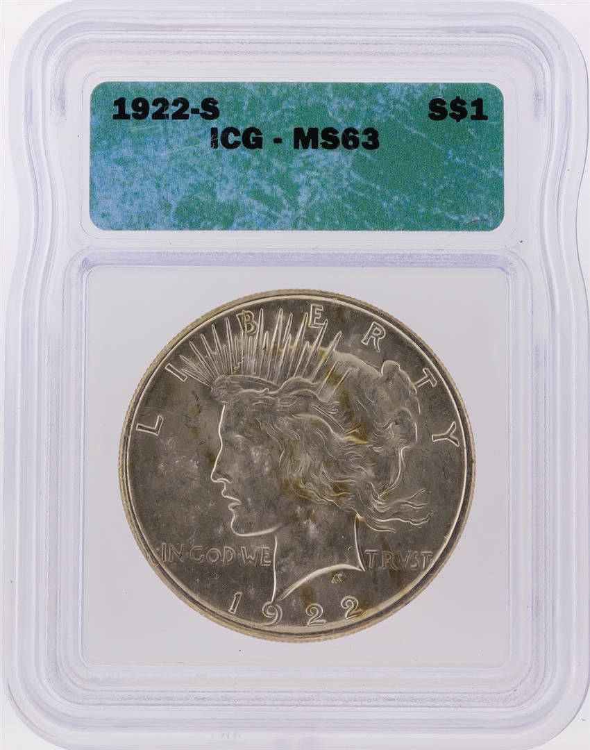 One 1922-S $1 Peace Silver Dollar Coin ICG Graded MS63. ICG Certified.