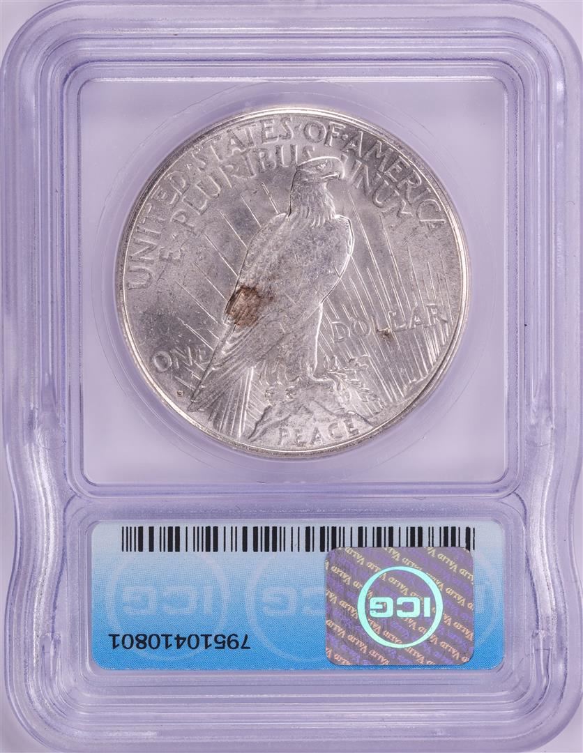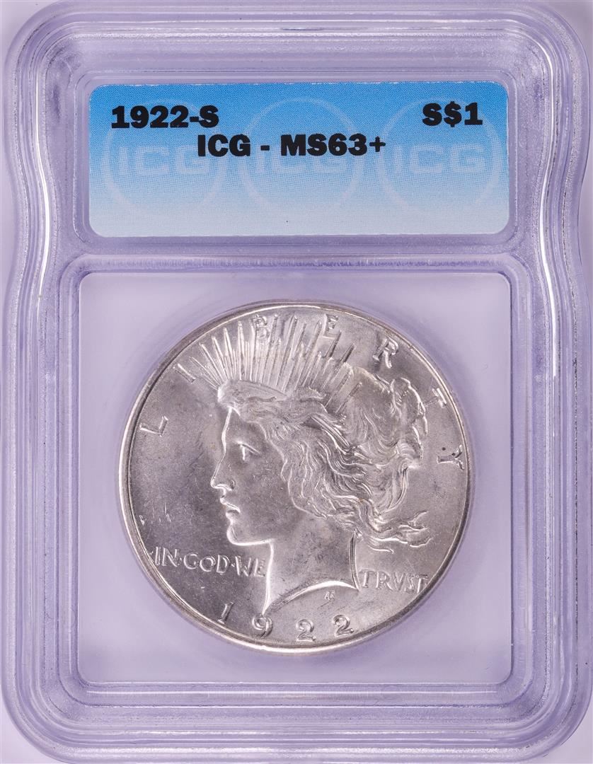 One 1922-S $1 Peace Silver Dollar Coin ICG MS63+. ICG Certified.