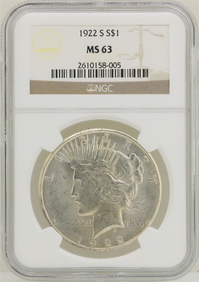 One 1922-S $1 Peace Silver Dollar Coin NGC MS63. NGC Certified.