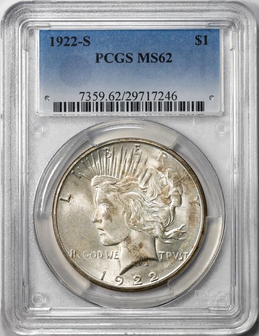 One 1922-S $1 Peace Silver Dollar Coin PCGS MS62. PCGS Graded.