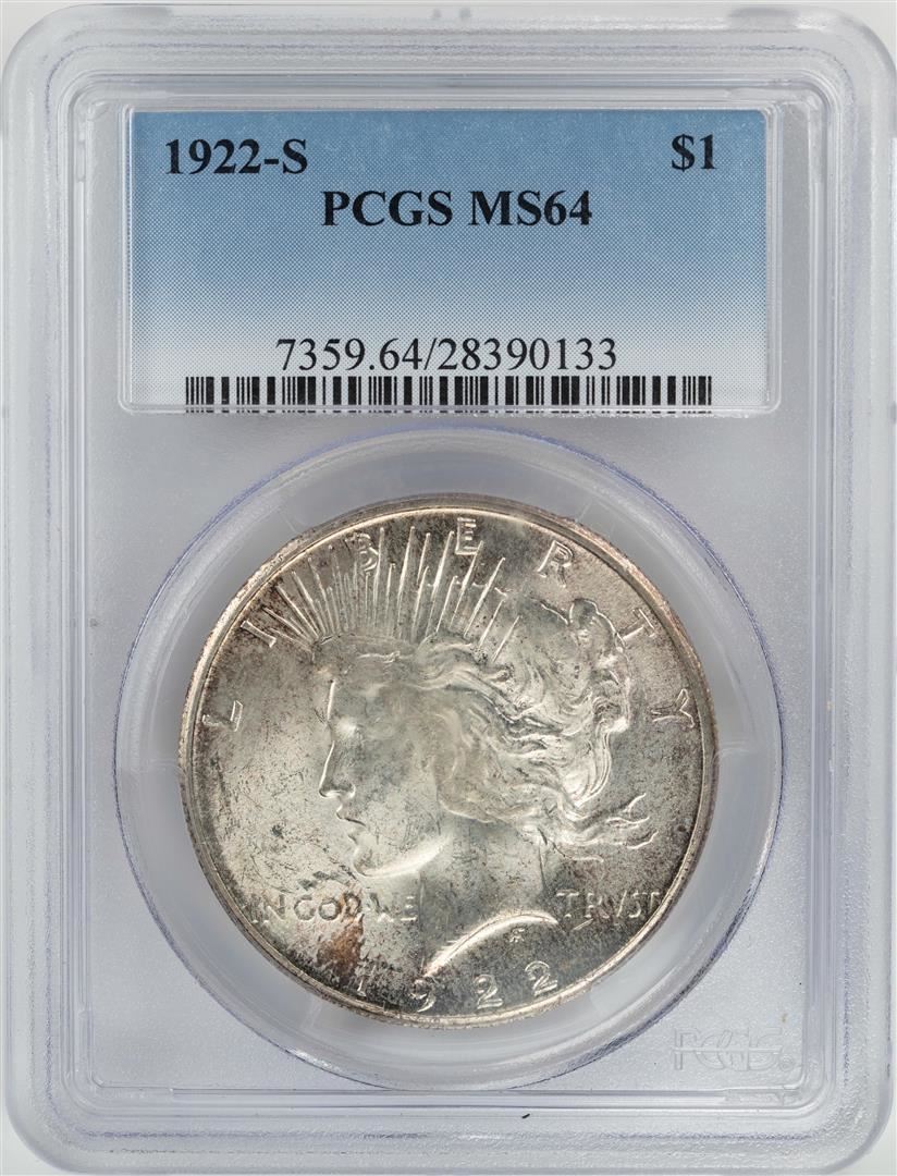 One 1922-S $1 Peace Silver Dollar Coin PCGS MS64. PCGS Graded.