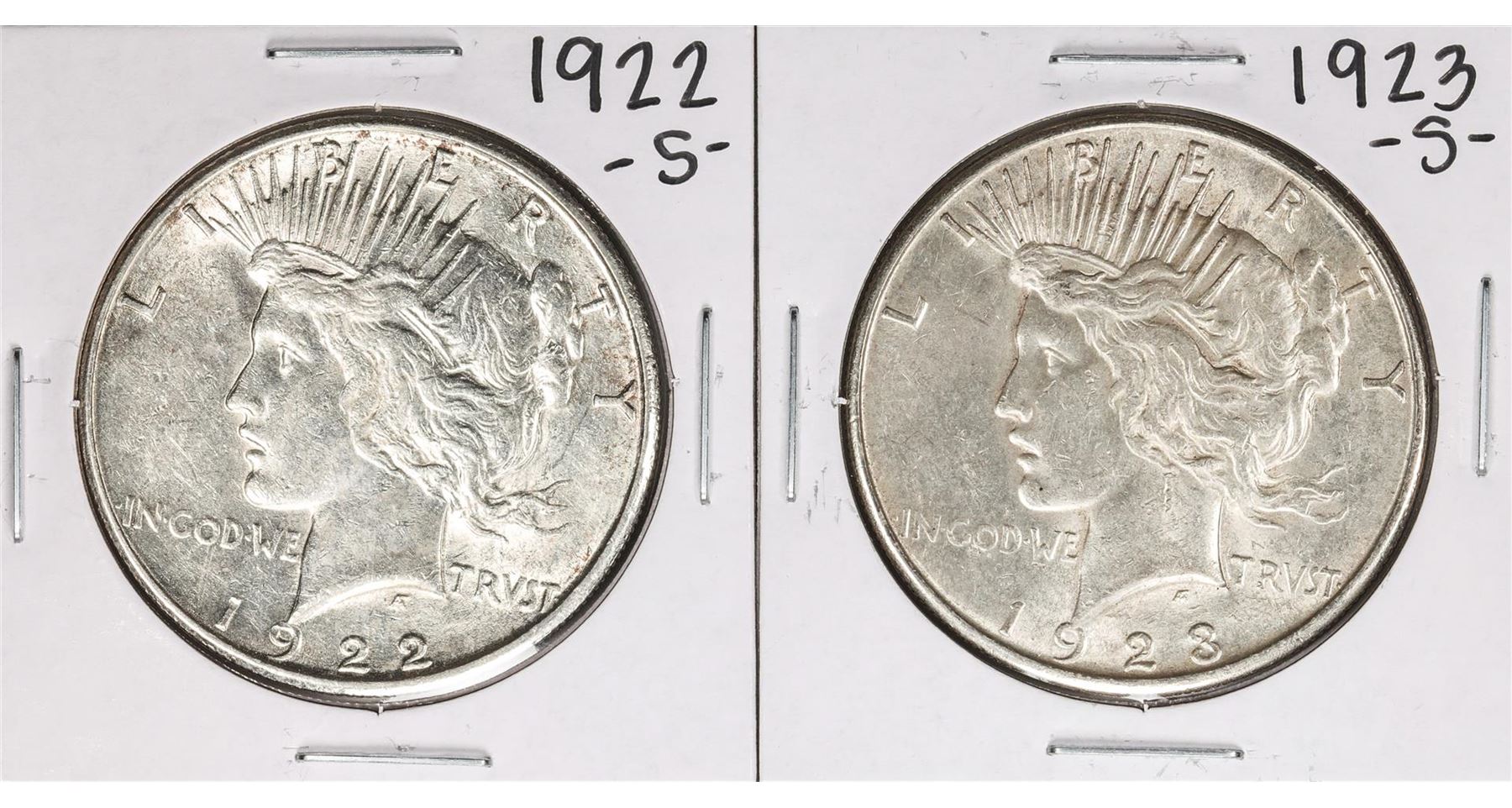 One 1922-S & 1923-S $1 Peace Silver Dollar Coins.